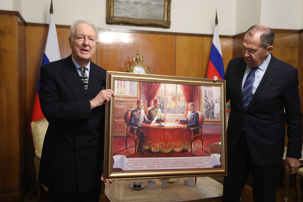 Председатель Комитета Русское наследие князь Н.Д.Лобанов-Ростовский на встрече с Министром иностранных дел России С.В.Лавровым вручил ему от имени Комитета картину "Подписание Константинопольского мирного договора".